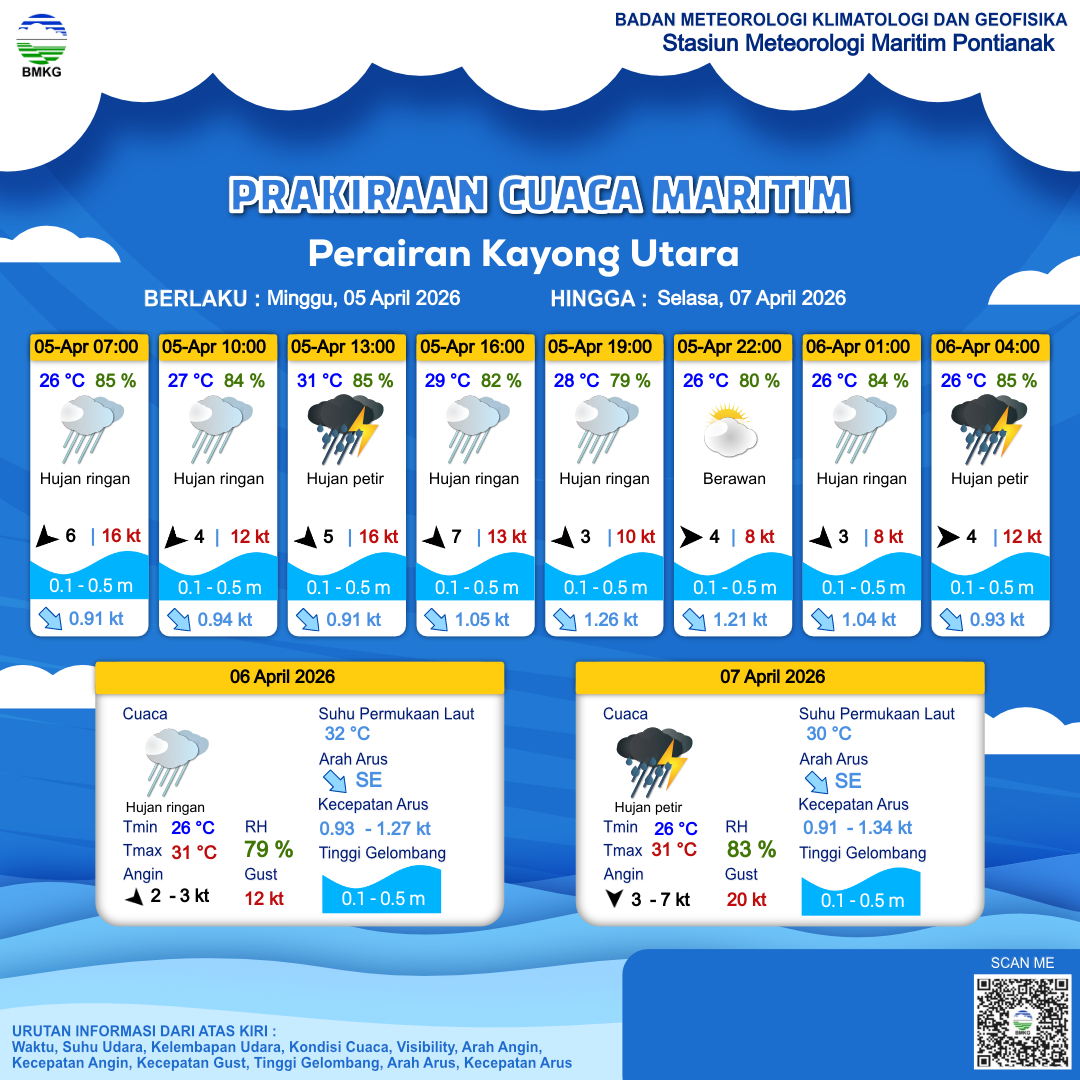 4 Apr 26, 21.00 2 jam kedepan | Hujan Ringan | Utara 6 kt Gust Peningkatan kecepatan angin yang singkat dan tiba-tiba : 12 kt | | | 26 °C | 84 % |