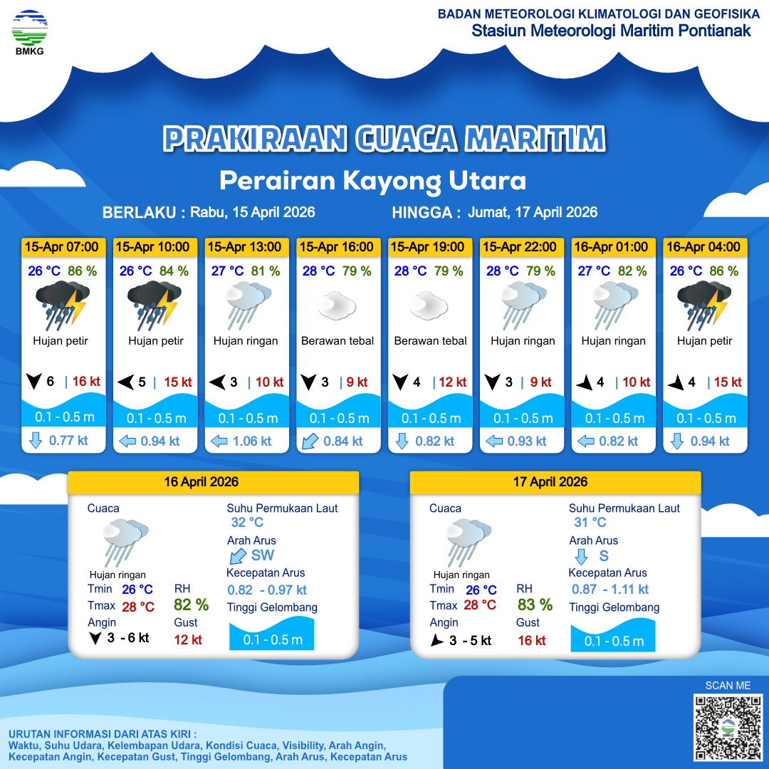 15 Apr 26, 18.00 5 jam kedepan | Barat Laut 4 kt Gust Peningkatan kecepatan angin yang singkat dan tiba-tiba : 10 kt | 0.4 m Tenang | Barat 0.8 Knots | 27 °C | 82 % | |
