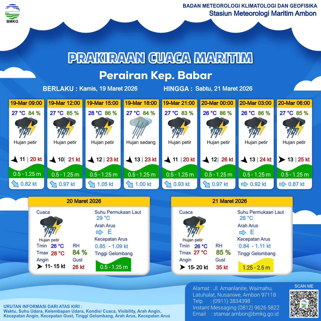 19 Mar 26, 21.00 15 jam kedepan | Barat 13 kt Gust Peningkatan kecepatan angin yang singkat dan tiba-tiba : 25 kt | 1.2 m Rendah | Timur 0.9 Knots | 27 °C | 85 % | |