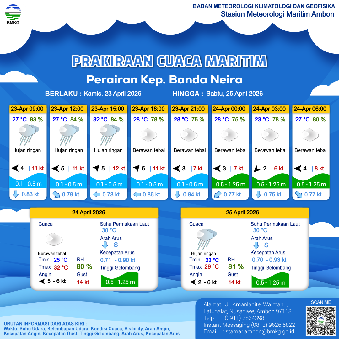 21 Apr 26, 23.00 4 jam kedepan | Hujan Ringan | Timur 8 kt Gust Peningkatan kecepatan angin yang singkat dan tiba-tiba : 11 kt | | | 27 °C | 82 % |