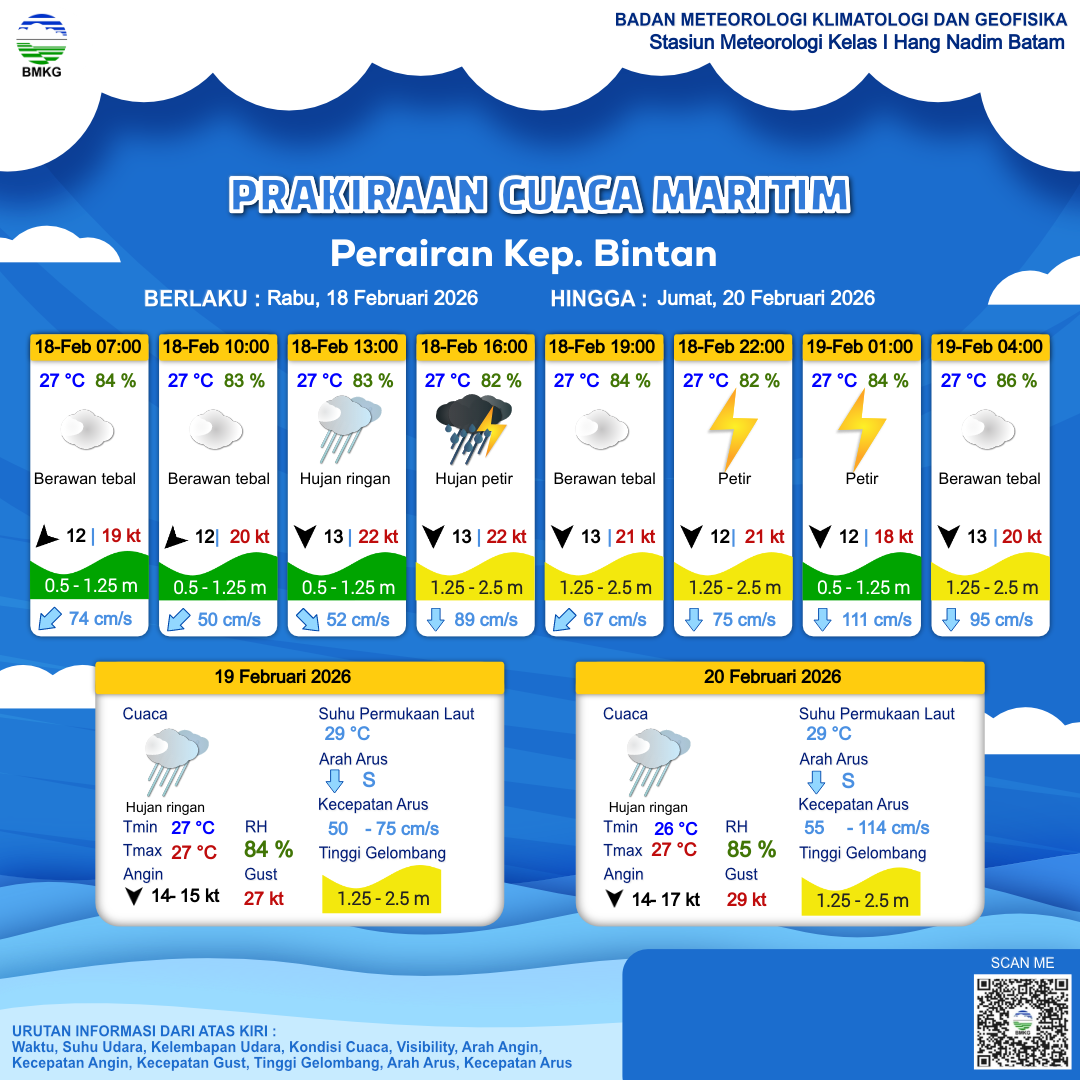 18 Feb 26, 12.00 2 jam kedepan | Utara 13 kt Gust Peningkatan kecepatan angin yang singkat dan tiba-tiba : 21 kt | 1.5 m Sedang | Barat Daya 67.0 cm/s | 27 °C | 84 % | |