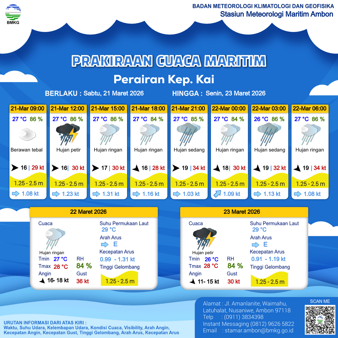 21 Mar 26, 07.00 2 jam kedepan | Barat 17 kt Gust Peningkatan kecepatan angin yang singkat dan tiba-tiba : 31 kt | 1.7 m Sedang | Timur 1.3 Knots | 27 °C | 86 % | |