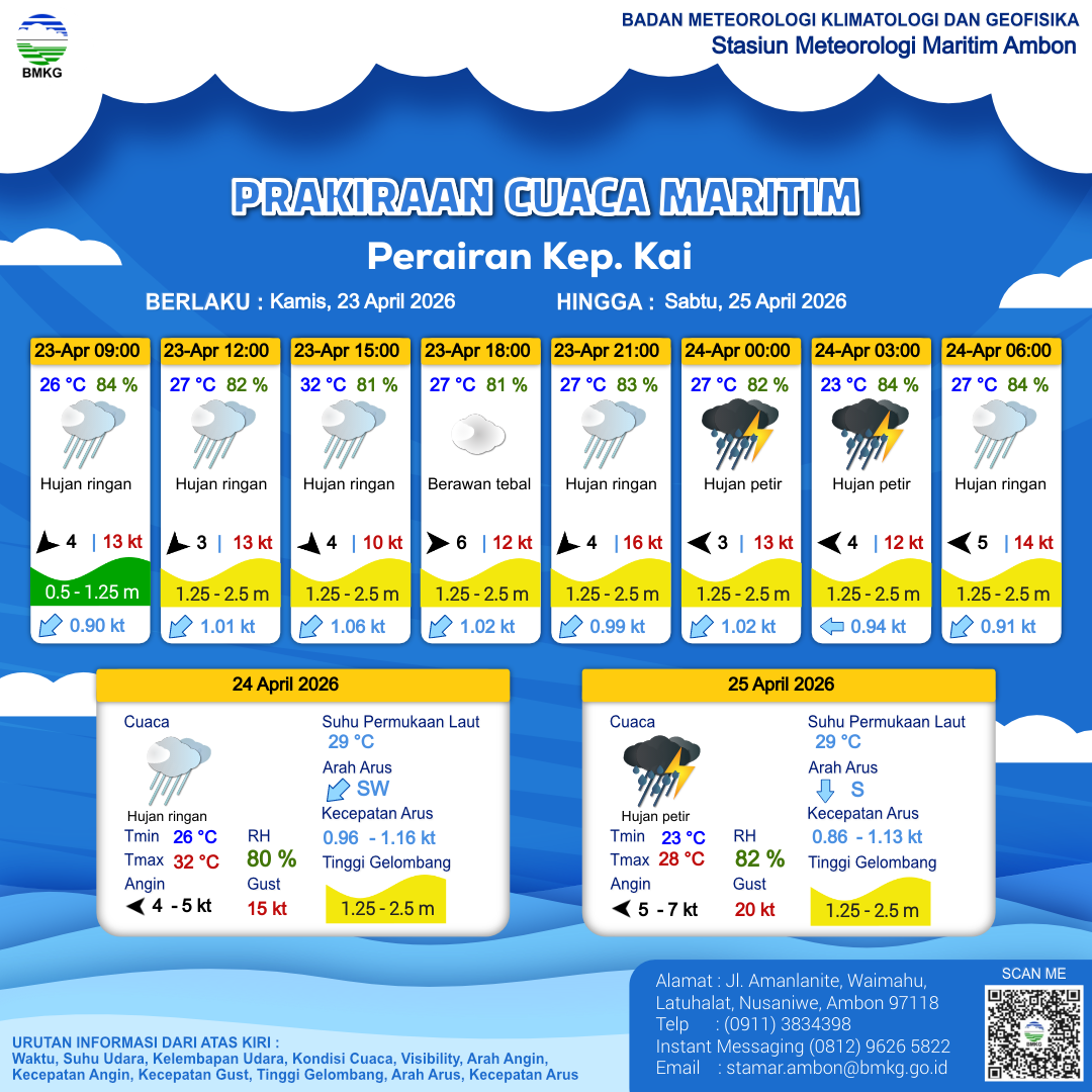 23 Apr 26, 23.00 20 jam kedepan | Timur 5 kt Gust Peningkatan kecepatan angin yang singkat dan tiba-tiba : 16 kt | 1.5 m Sedang | Barat Daya 0.9 Knots | 27 °C | 83 % |