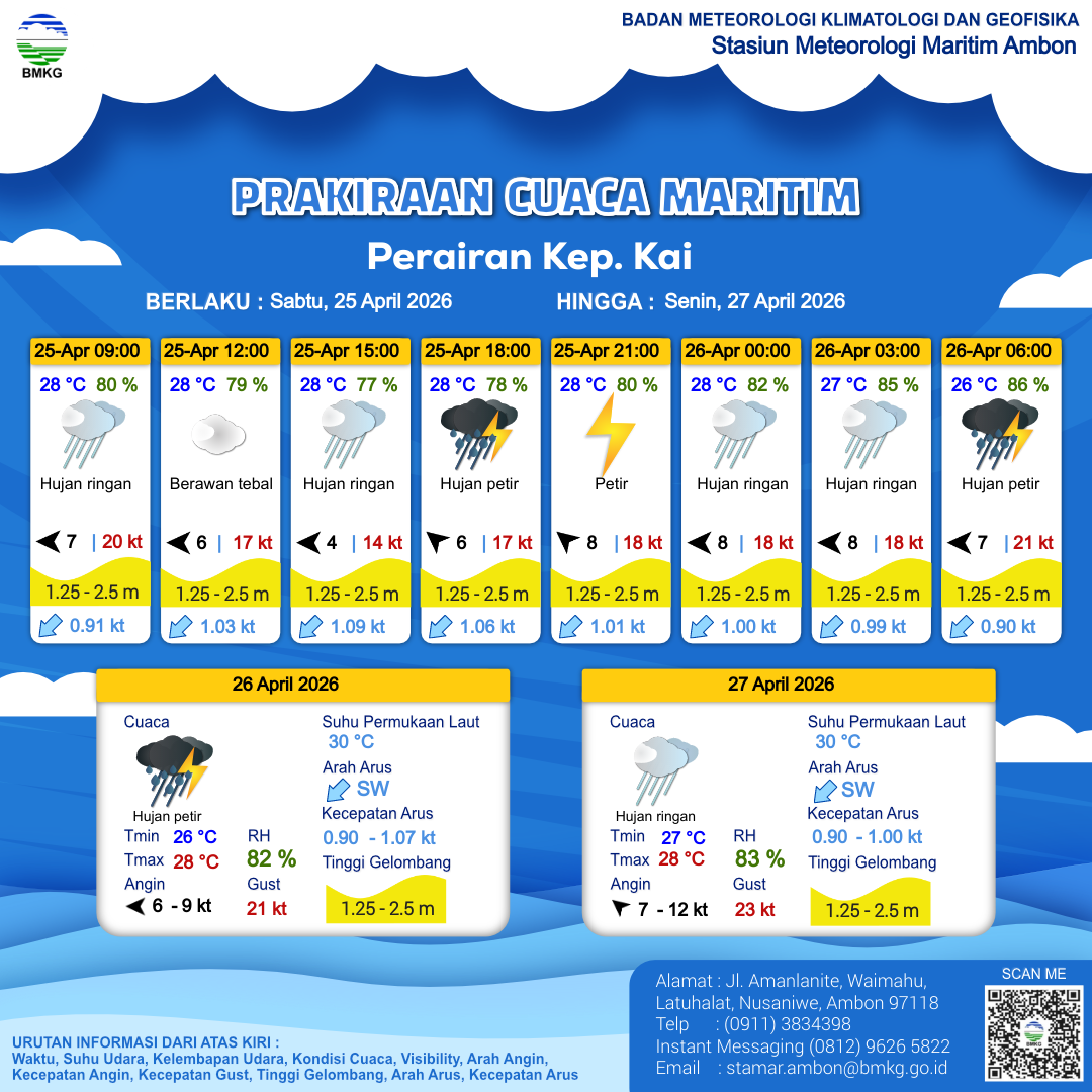 24 Apr 26, 21.00 12 jam kedepan | Timur 7 kt Gust Peningkatan kecepatan angin yang singkat dan tiba-tiba : 16 kt | 1.3 m Sedang | Selatan 0.9 Knots | 27 °C | 84 % | |