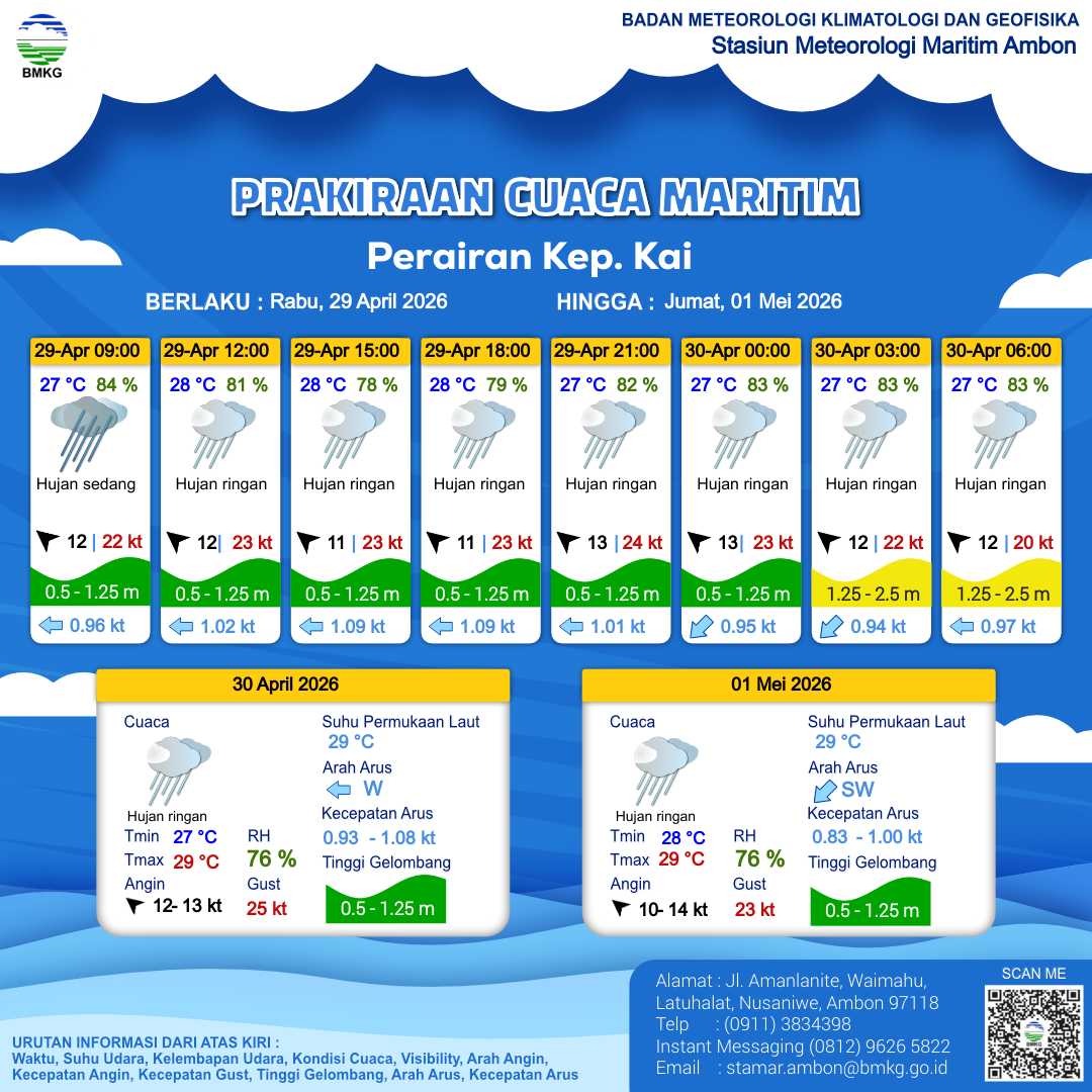 27 Apr 26, 22.00 4 jam kedepan | Hujan Ringan | Timur 11 kt Gust Peningkatan kecepatan angin yang singkat dan tiba-tiba : 22 kt | | | 26 °C | 85 % |