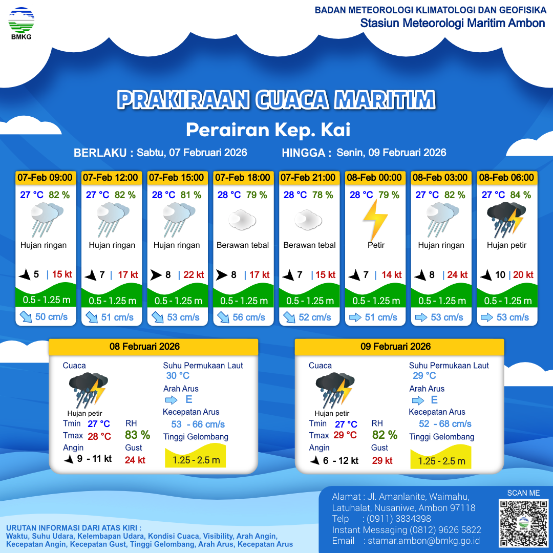 7 Feb 26, 09.00 11 jam kedepan | Barat 8 kt Gust Peningkatan kecepatan angin yang singkat dan tiba-tiba : 17 kt | 0.6 m Rendah | Tenggara 56.0 cm/s | 28 °C | 79 % | |