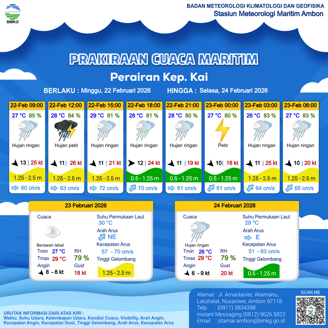 22 Feb 26, 22.00 6 jam kedepan | Barat Laut 10 kt Gust Peningkatan kecepatan angin yang singkat dan tiba-tiba : 18 kt | 1.4 m Sedang | Timur Laut 64.0 cm/s | 27 °C | 82 % | |