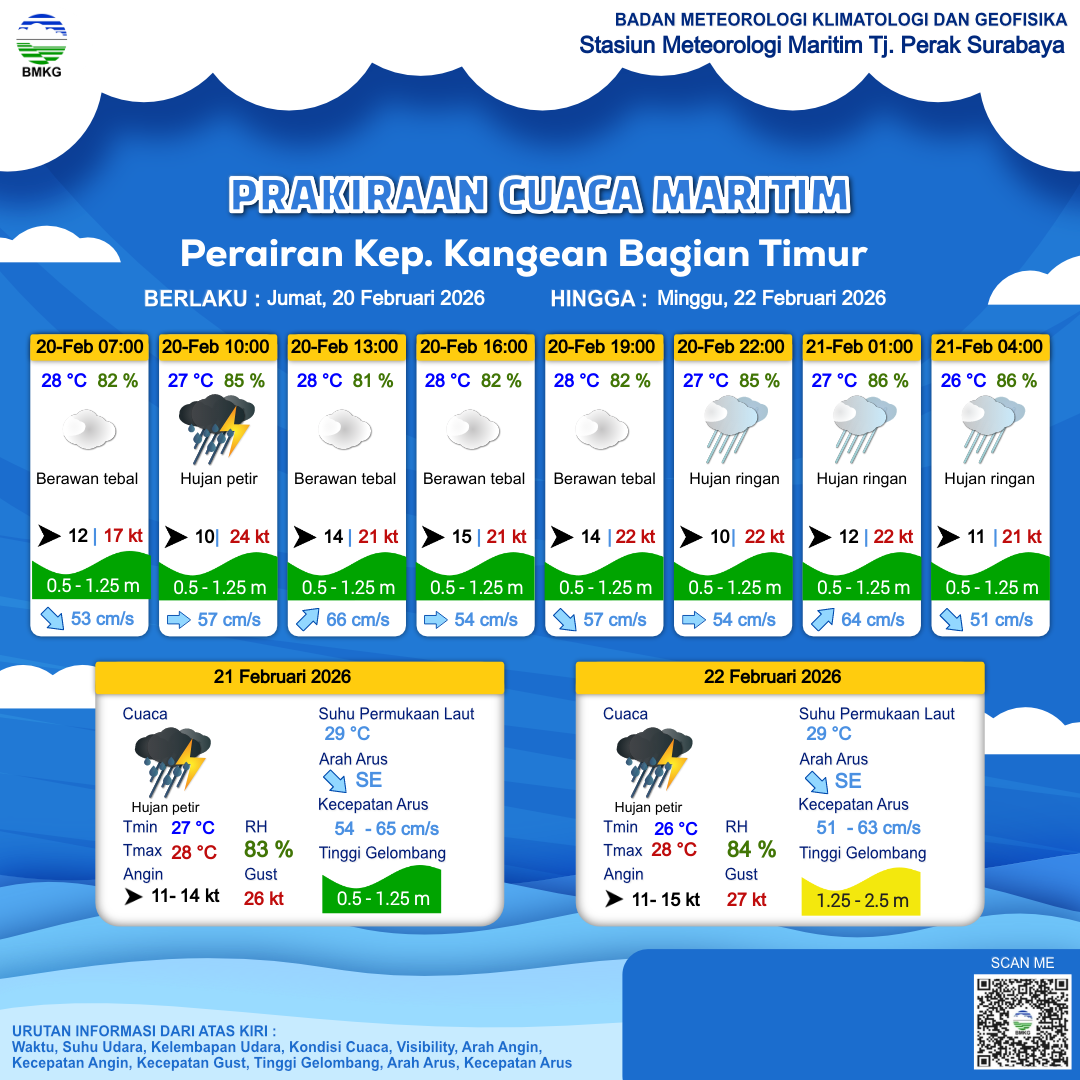 20 Feb 26, 18.00 4 jam kedepan | Barat 12 kt Gust Peningkatan kecepatan angin yang singkat dan tiba-tiba : 22 kt | 0.7 m Rendah | Timur Laut 64.0 cm/s | 27 °C | 86 % | |