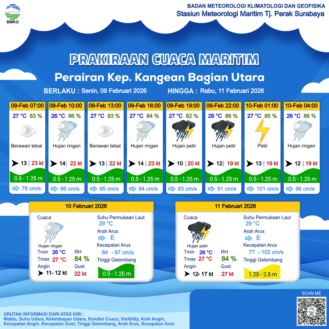 8 Feb 26, 23.00 2 jam kedepan | Hujan Petir | Barat 14 kt Gust Peningkatan kecepatan angin yang singkat dan tiba-tiba : 23 kt | | | 26 °C | 86 % |