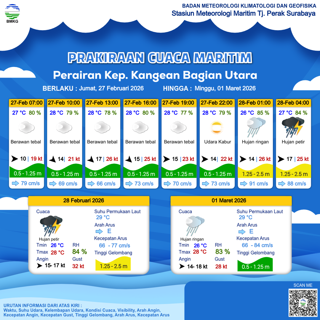27 Feb 26, 23.00 3 jam kedepan | Berawan Tebal | Barat 15 kt Gust Peningkatan kecepatan angin yang singkat dan tiba-tiba : 24 kt | | | 27 °C | 82 % |