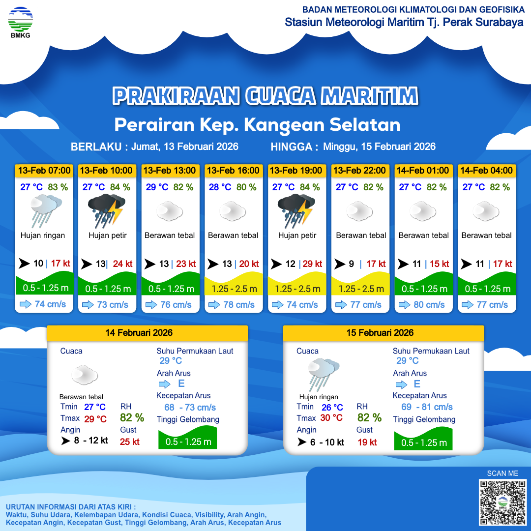 13 Feb 26, 09.00 4 jam kedepan | Barat 13 kt Gust Peningkatan kecepatan angin yang singkat dan tiba-tiba : 20 kt | 1.4 m Sedang | Timur 78.0 cm/s | 28 °C | 80 % | |