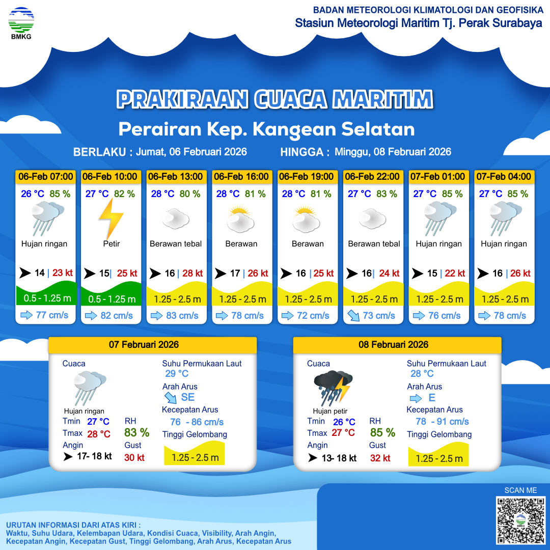 6 Feb 26, 07.00 3 jam kedepan | Barat 16 kt Gust Peningkatan kecepatan angin yang singkat dan tiba-tiba : 29 kt | 1.4 m Sedang | Timur 82.0 cm/s | 28 °C | 81 % | |