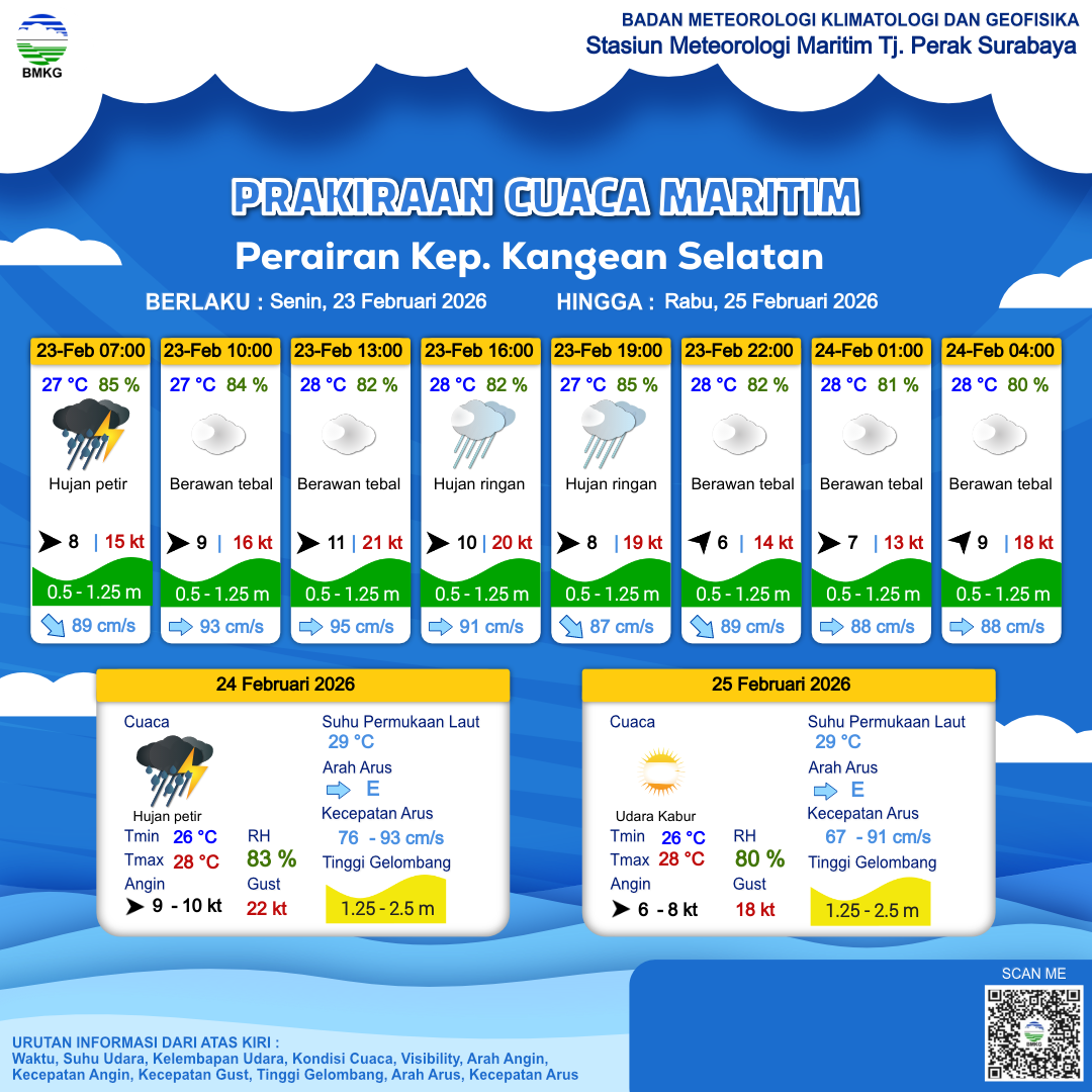 23 Feb 26, 03.00 2 jam kedepan | Barat 9 kt Gust Peningkatan kecepatan angin yang singkat dan tiba-tiba : 16 kt | 0.7 m Rendah | Timur 93.0 cm/s | 27 °C | 84 % | |