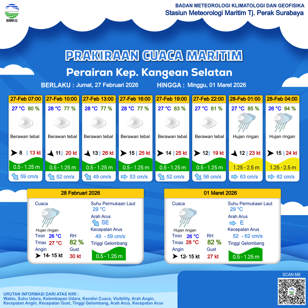 27 Feb 26, 08.00 4 jam kedepan | Barat 15 kt Gust Peningkatan kecepatan angin yang singkat dan tiba-tiba : 26 kt | 0.9 m Rendah | Timur 51.0 cm/s | 28 °C | 75 % | |