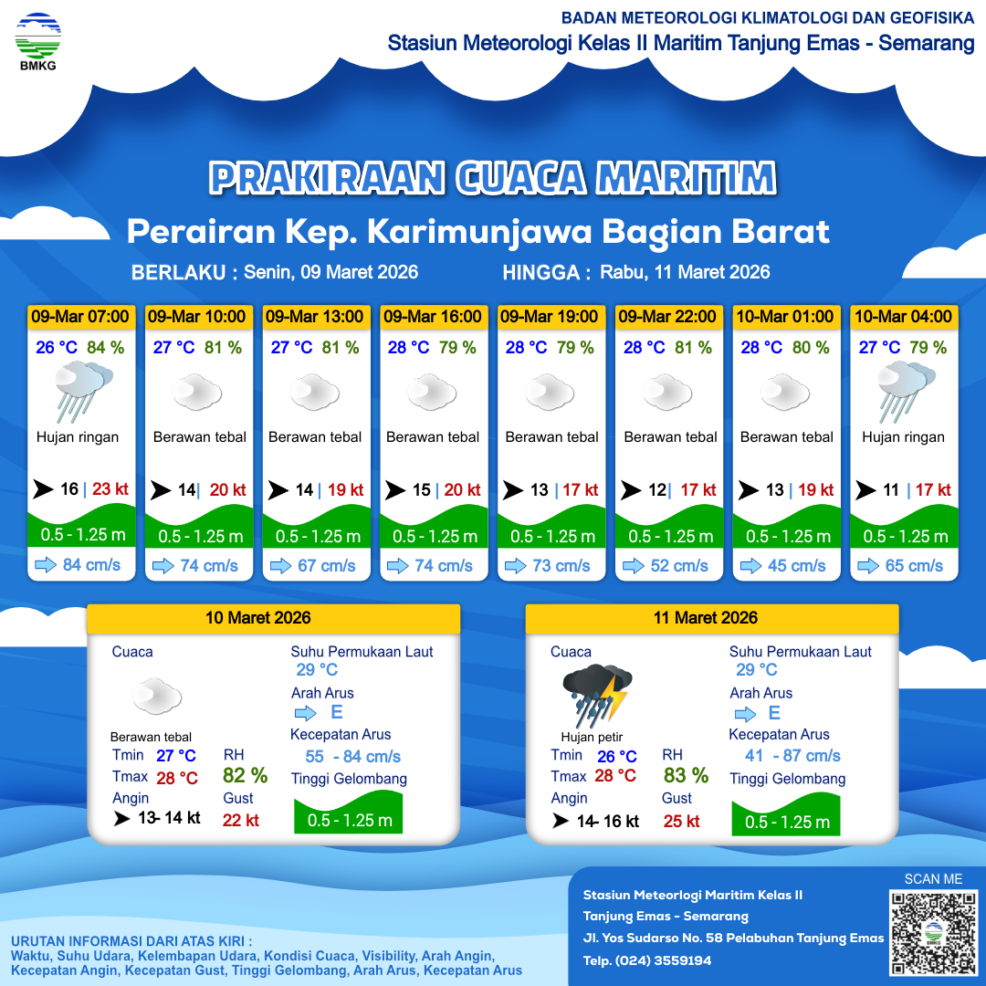 9 Mar 26, 23.00 4 jam kedepan | Berawan Tebal | Barat 14 kt Gust Peningkatan kecepatan angin yang singkat dan tiba-tiba : 23 kt | | | 27 °C | 82 % |
