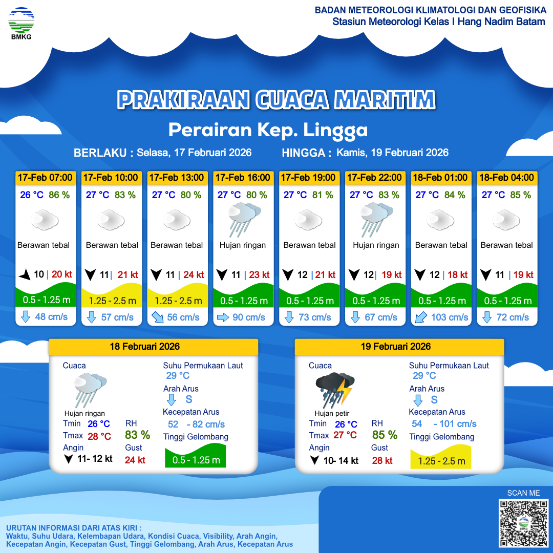 17 Feb 26, 14.00 3 jam kedepan | Utara 12 kt Gust Peningkatan kecepatan angin yang singkat dan tiba-tiba : 20 kt | 1.1 m Rendah | Selatan 57.0 cm/s | 27 °C | 83 % | |