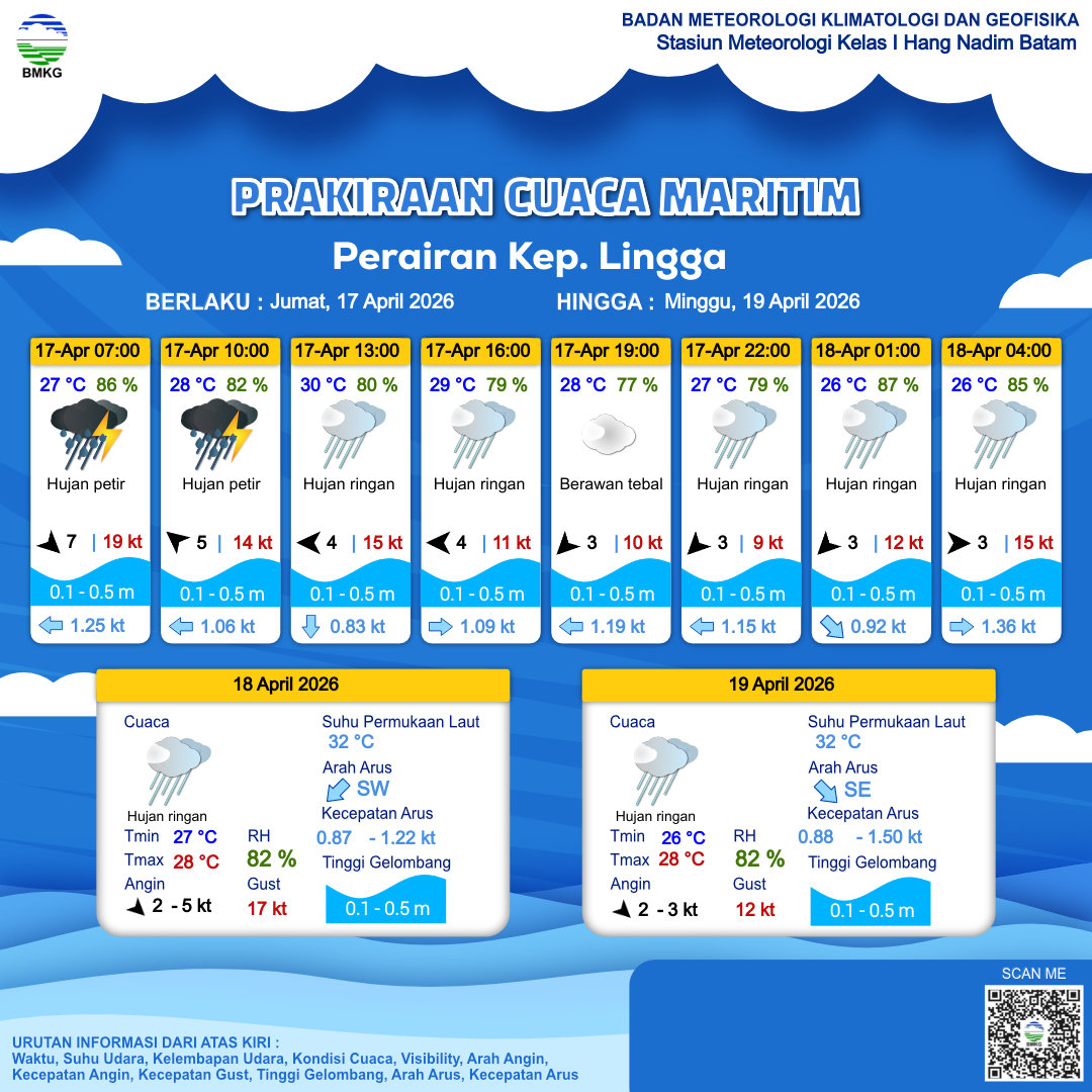 17 Apr 26, 06.00 3 jam kedepan | Timur 4 kt Gust Peningkatan kecepatan angin yang singkat dan tiba-tiba : 15 kt | 0.5 m Rendah | Selatan 0.8 Knots | 30 °C | 80 % | |