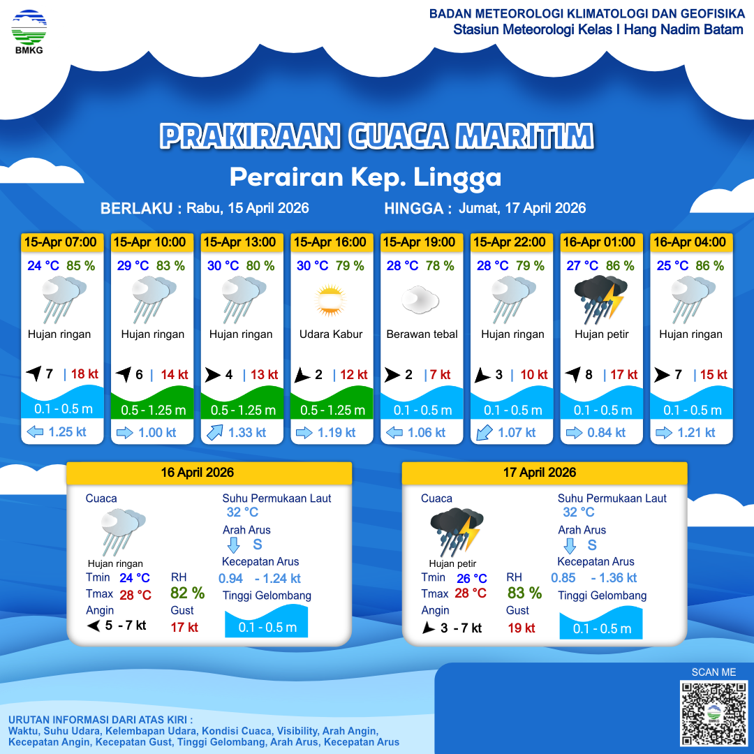 15 Apr 26, 06.00 4 jam kedepan | Barat 4 kt Gust Peningkatan kecepatan angin yang singkat dan tiba-tiba : 13 kt | 0.8 m Rendah | Timur Laut 1.3 Knots | 30 °C | 80 % | |