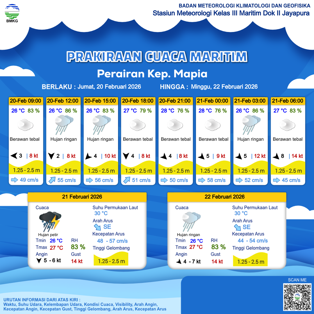 20 Feb 26, 23.00 2 jam kedepan | Berawan Tebal | Utara 6 kt Gust Peningkatan kecepatan angin yang singkat dan tiba-tiba : 12 kt | | | 27 °C | 80 % |