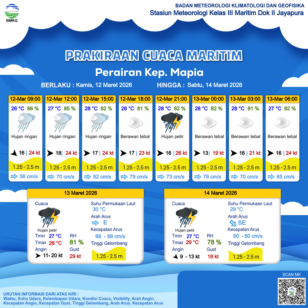 12 Mar 26, 06.00 2 jam kedepan | Barat 17 kt Gust Peningkatan kecepatan angin yang singkat dan tiba-tiba : 24 kt | 2.1 m Sedang | Timur 82.0 cm/s | 28 °C | 82 % | |