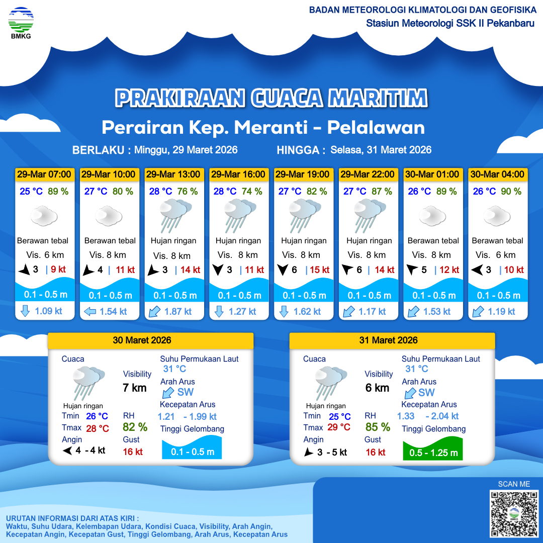 29 Mar 26, 05.00 15 jam yang lalu | Hujan Ringan | Timur Laut 3 kt Gust Peningkatan kecepatan angin yang singkat dan tiba-tiba : 12 kt | | | 28 °C | 75 % |