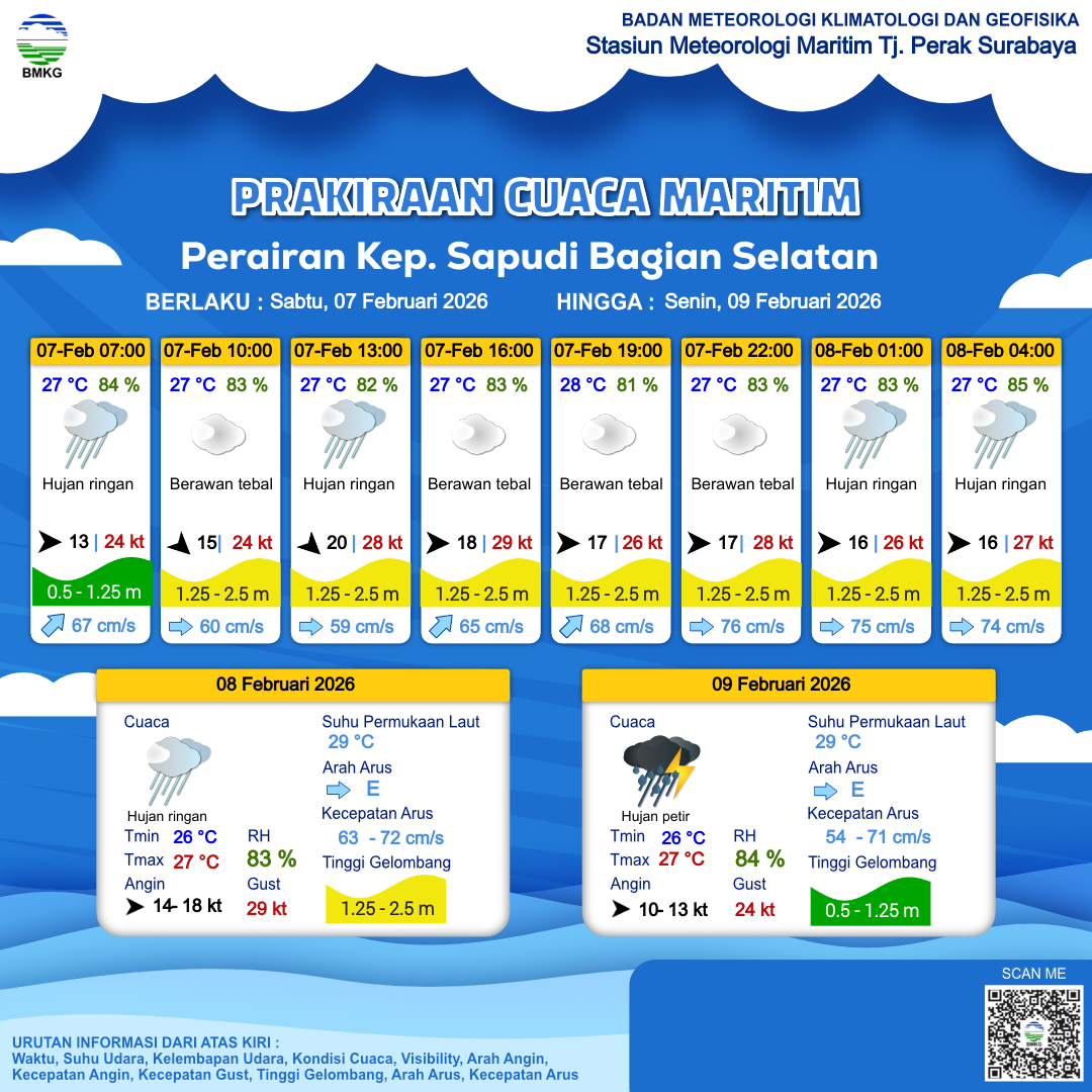 7 Feb 26, 22.00 22 jam kedepan | Barat 16 kt Gust Peningkatan kecepatan angin yang singkat dan tiba-tiba : 26 kt | 1.5 m Sedang | Timur 74.0 cm/s | 27 °C | 83 % | |