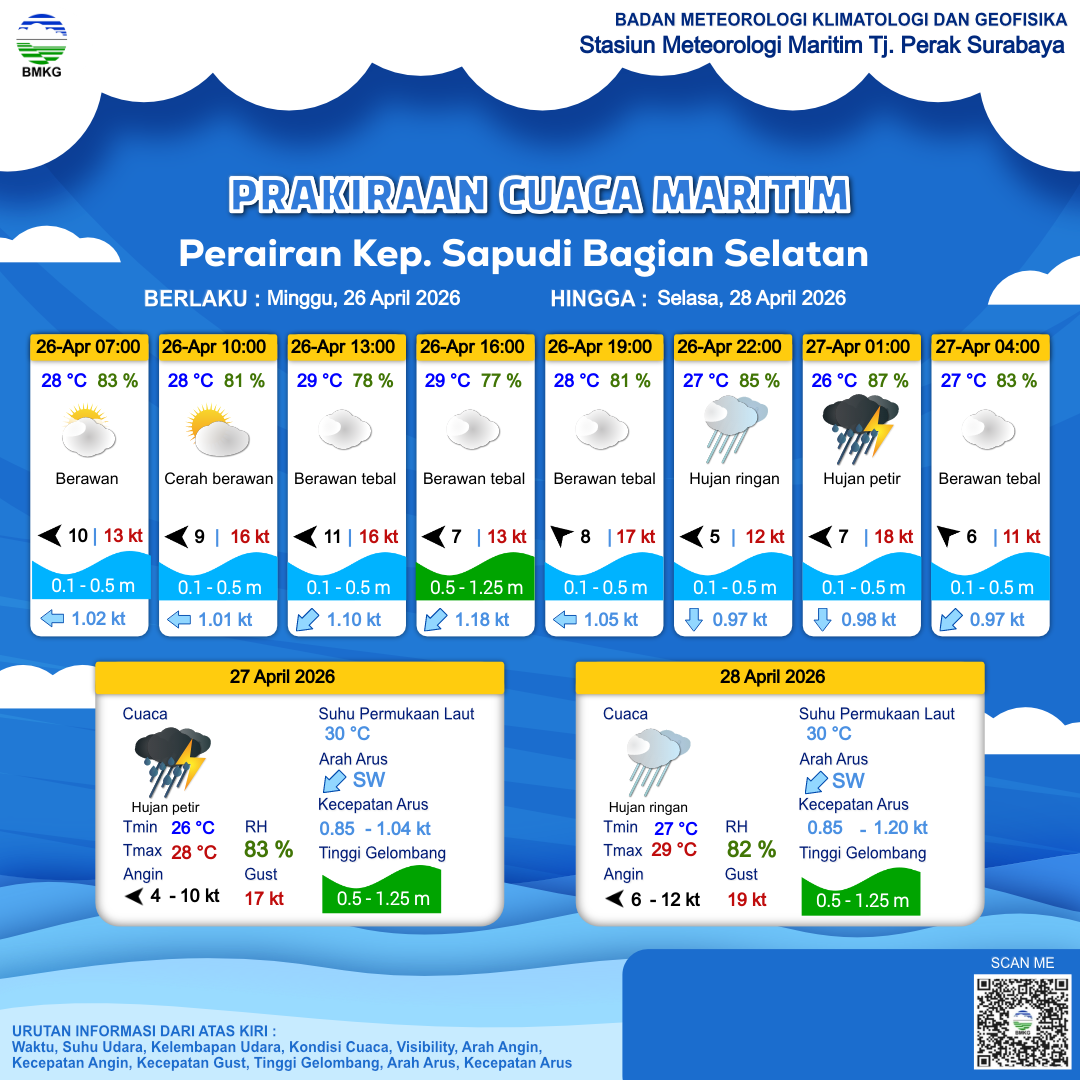 24 Apr 26, 20.00 6 jam kedepan | Tenggara 9 kt Gust Peningkatan kecepatan angin yang singkat dan tiba-tiba : 14 kt | 0.6 m Rendah | Barat Daya 1.1 Knots | 29 °C | 78 % | |