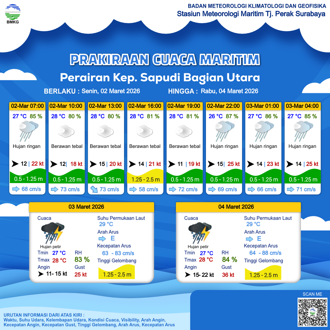 2 Mar 26, 19.00 12 jam kedepan | Barat 14 kt Gust Peningkatan kecepatan angin yang singkat dan tiba-tiba : 24 kt | 0.7 m Rendah | Timur 67.0 cm/s | 27 °C | 86 % | |