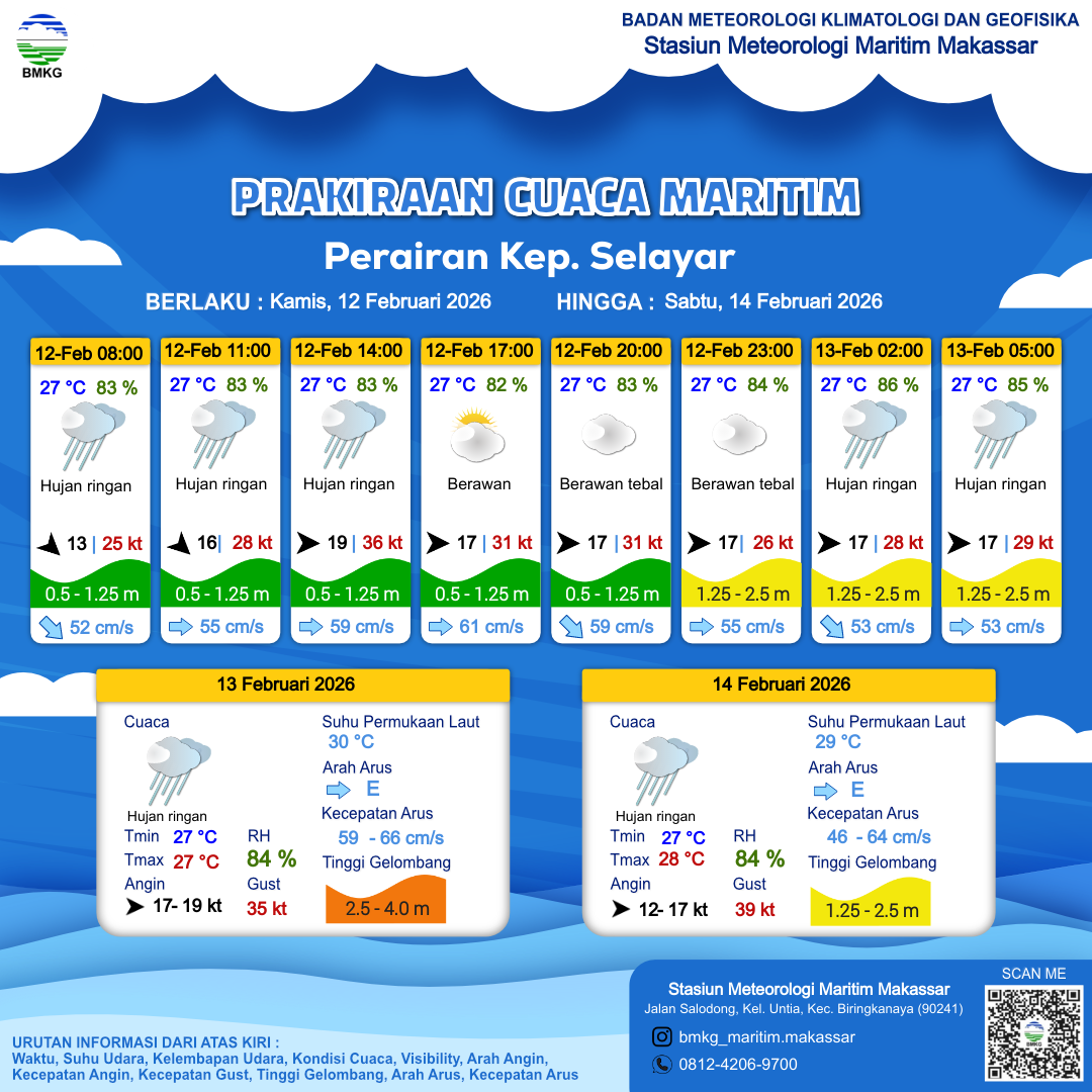 12 Feb 26, 13.00 7 jam kedepan | Barat 17 kt Gust Peningkatan kecepatan angin yang singkat dan tiba-tiba : 28 kt | 1.2 m Rendah | Timur 60.0 cm/s | 27 °C | 83 % | |