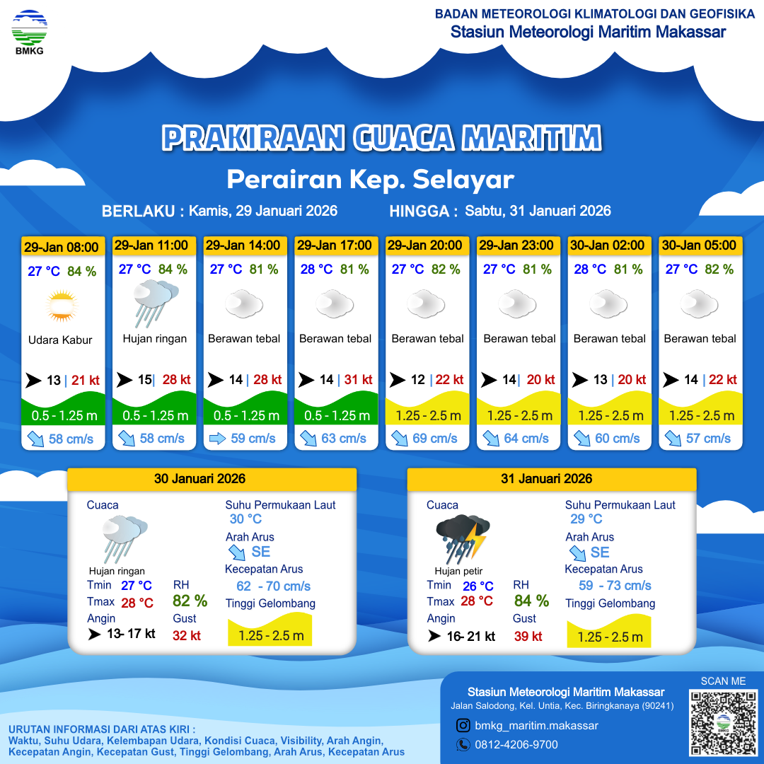 29 Jan 26, 07.00 4 jam kedepan | Barat 14 kt Gust Peningkatan kecepatan angin yang singkat dan tiba-tiba : 29 kt | 0.8 m Rendah | Tenggara 60.0 cm/s | 27 °C | 81 % | |