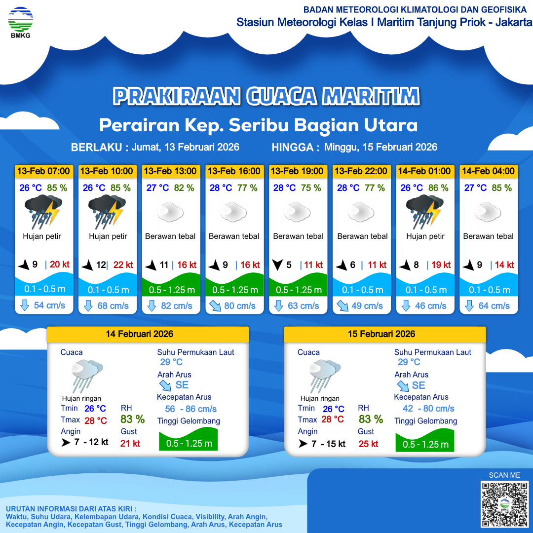 13 Feb 26, 18.00 2 jam kedepan | Barat Laut 8 kt Gust Peningkatan kecepatan angin yang singkat dan tiba-tiba : 19 kt | 0.4 m Tenang | Selatan 46.0 cm/s | 26 °C | 86 % | |