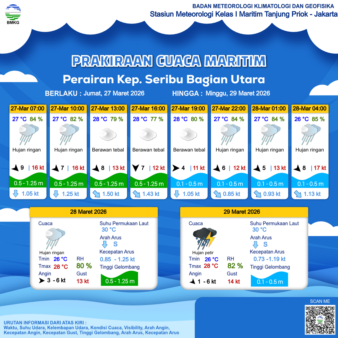 27 Mar 26, 08.00 5 jam kedepan | Utara 7 kt Gust Peningkatan kecepatan angin yang singkat dan tiba-tiba : 12 kt | 0.6 m Rendah | Tenggara 1.5 Knots | 28 °C | 77 % | |
