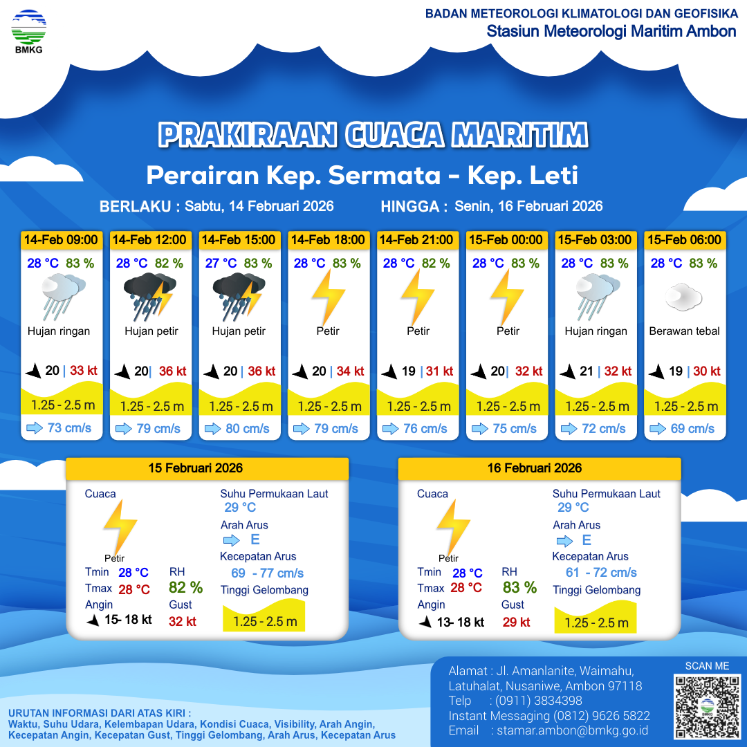 14 Feb 26, 13.00 3 jam kedepan | Barat Laut 19 kt Gust Peningkatan kecepatan angin yang singkat dan tiba-tiba : 31 kt | 1.7 m Sedang | Timur 77.0 cm/s | 28 °C | 82 % | |