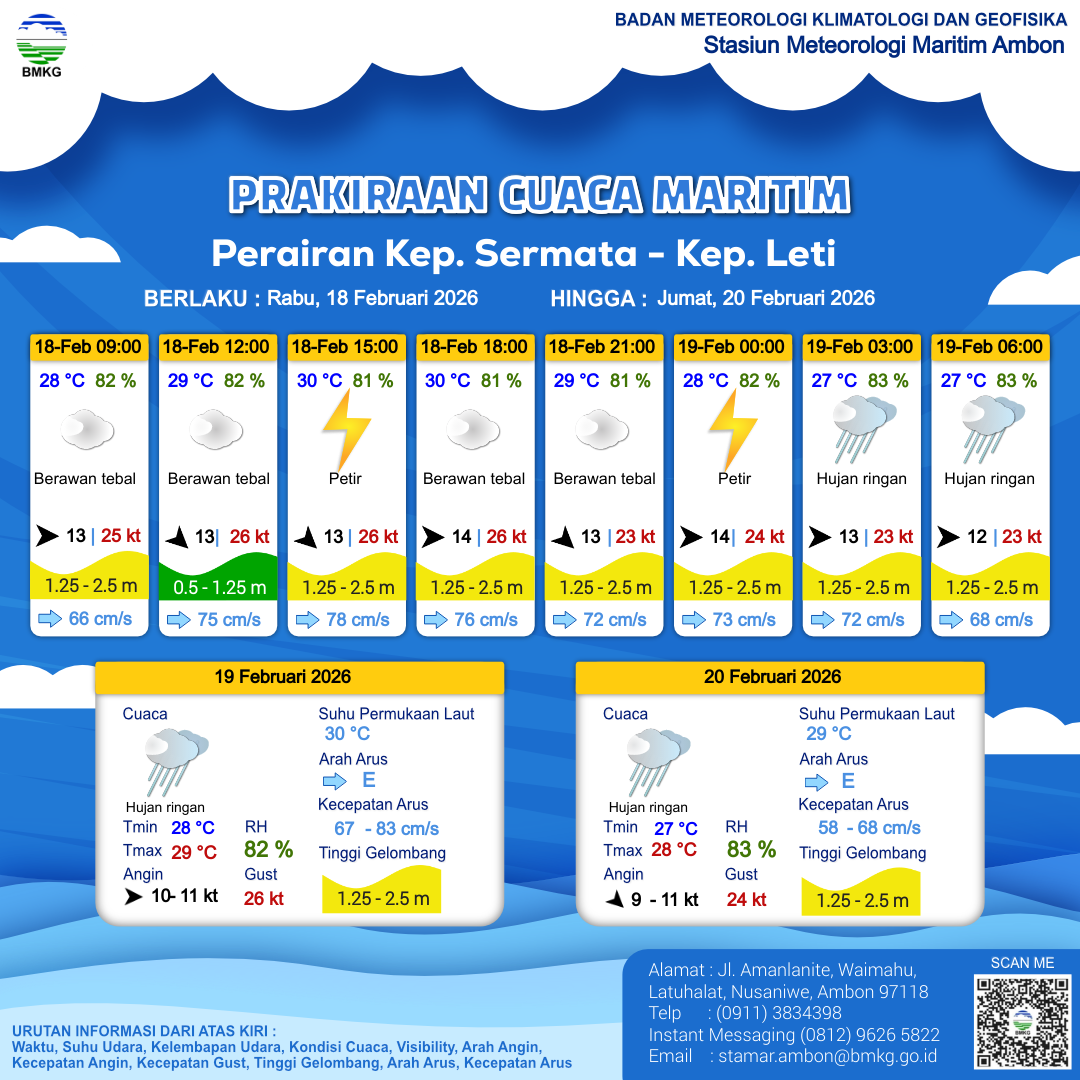 18 Feb 26, 22.00 4 jam kedepan | Barat 12 kt Gust Peningkatan kecepatan angin yang singkat dan tiba-tiba : 23 kt | 1.3 m Sedang | Timur 67.0 cm/s | 27 °C | 83 % | |