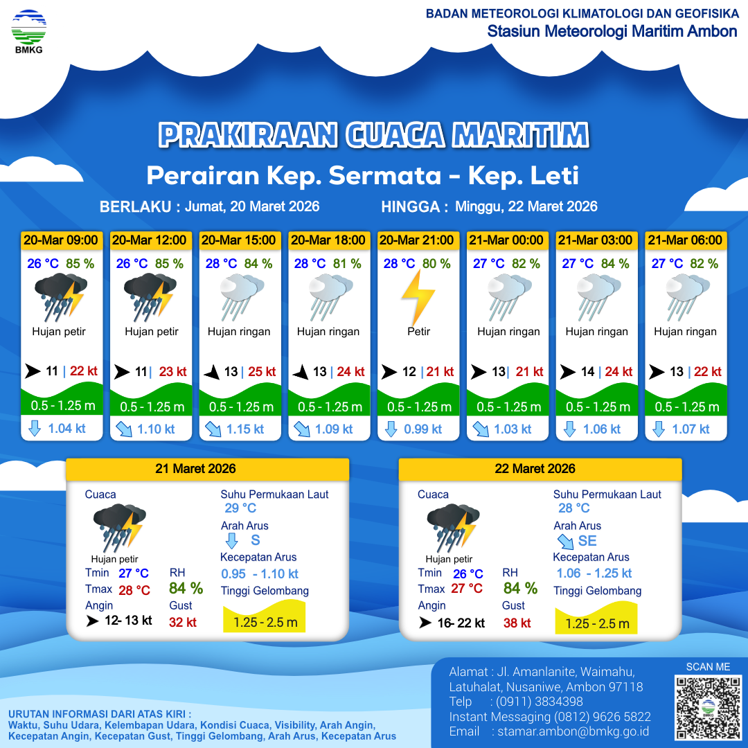 20 Mar 26, 14.00 12 jam kedepan | Barat 13 kt Gust Peningkatan kecepatan angin yang singkat dan tiba-tiba : 21 kt | 1.1 m Rendah | Tenggara 1.0 Knots | 28 °C | 81 % | |
