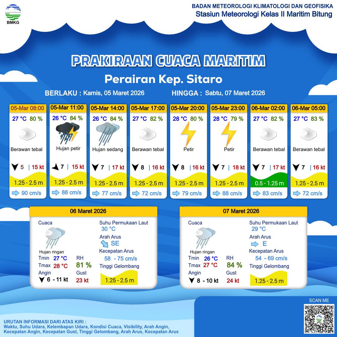 5 Mar 26, 11.00 11 jam kedepan | Utara 8 kt Gust Peningkatan kecepatan angin yang singkat dan tiba-tiba : 15 kt | 1.3 m Sedang | Timur 74.0 cm/s | 27 °C | 80 % | |