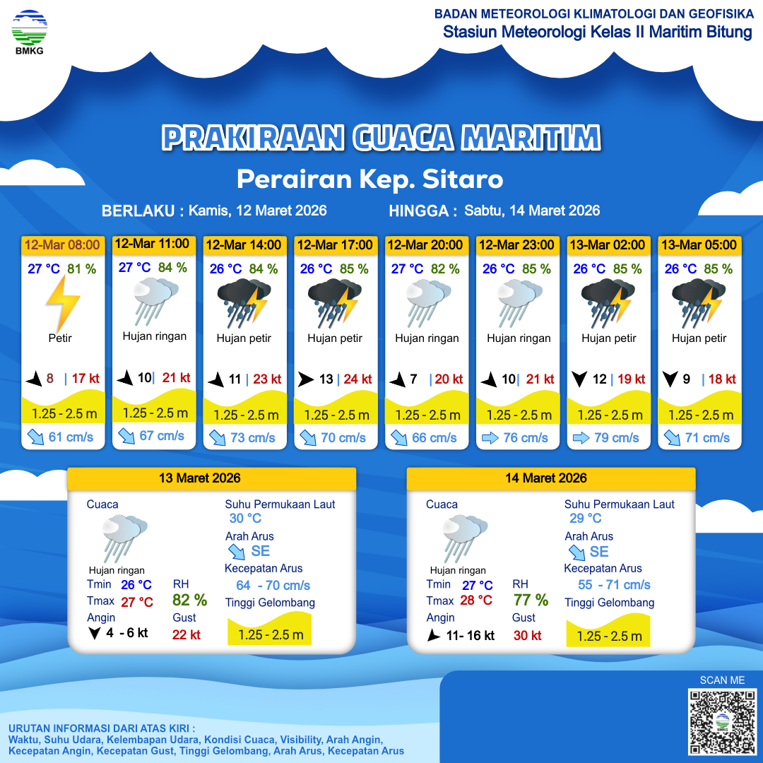 12 Mar 26, 14.00 13 jam kedepan | Barat Laut 10 kt Gust Peningkatan kecepatan angin yang singkat dan tiba-tiba : 18 kt | 2.4 m Sedang | Timur 73.0 cm/s | 26 °C | 84 % | |