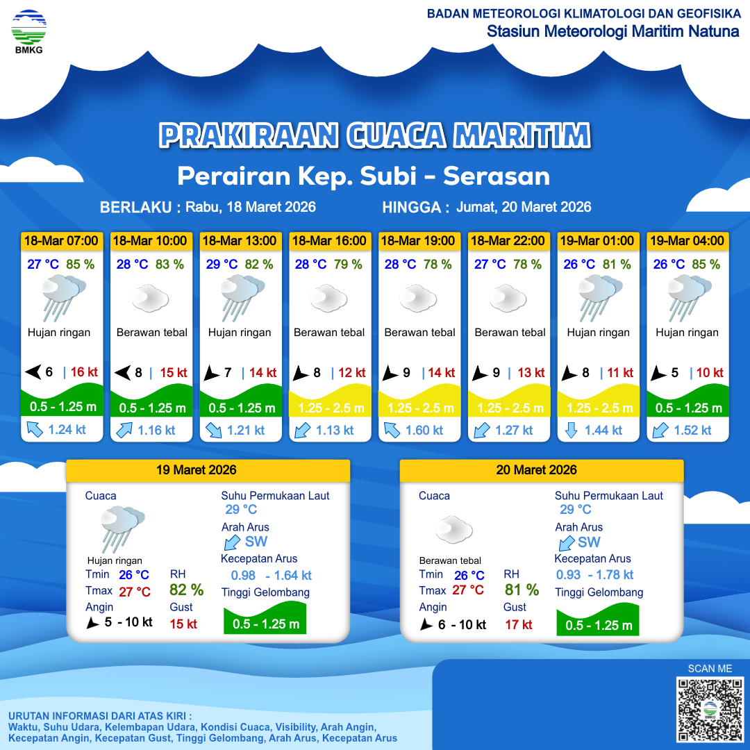 18 Mar 26, 22.00 6 jam kedepan | Timur Laut 5 kt Gust Peningkatan kecepatan angin yang singkat dan tiba-tiba : 12 kt | 1.2 m Rendah | Barat 1.6 Knots | 26 °C | 85 % | |