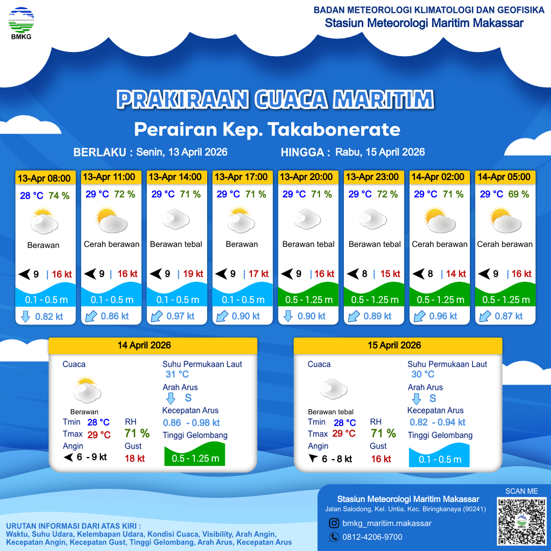 13 Apr 26, 22.00 12 jam kedepan | Timur 9 kt Gust Peningkatan kecepatan angin yang singkat dan tiba-tiba : 17 kt | 0.7 m Rendah | Barat Daya 0.9 Knots | 29 °C | 69 % | |