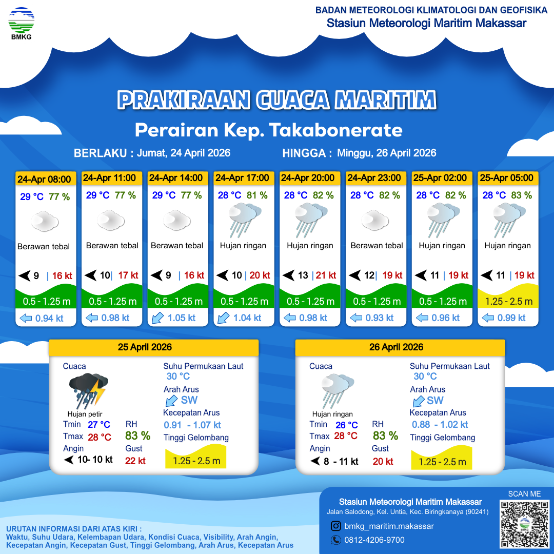 23 Apr 26, 23.00 2 jam kedepan | Berawan Tebal | Timur 10 kt Gust Peningkatan kecepatan angin yang singkat dan tiba-tiba : 15 kt | | | 28 °C | 81 % |