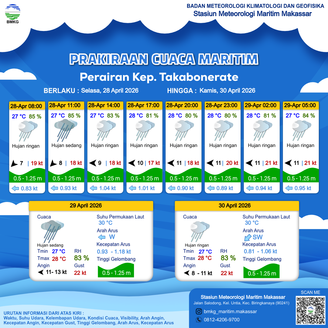 27 Apr 26, 13.00 2 jam kedepan | Timur 10 kt Gust Peningkatan kecepatan angin yang singkat dan tiba-tiba : 16 kt | 1.1 m Rendah | Barat 0.9 Knots | 28 °C | 80 % | |