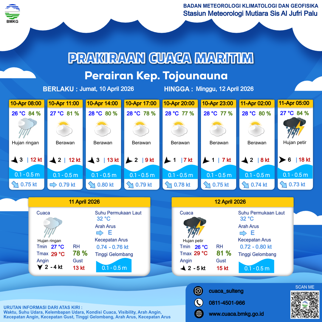 10 Apr 26, 20.00 2 jam kedepan | Hujan Petir | Barat 6 kt Gust Peningkatan kecepatan angin yang singkat dan tiba-tiba : 12 kt | | | 27 °C | 84 % |