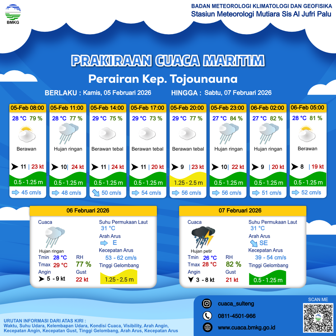 5 Feb 26, 14.00 16 jam kedepan | Barat 10 kt Gust Peningkatan kecepatan angin yang singkat dan tiba-tiba : 23 kt | 1.4 m Sedang | Timur 57.0 cm/s | 28 °C | 80 % | |