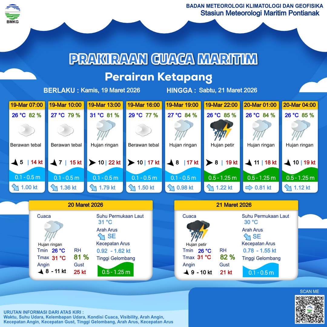 19 Mar 26, 06.00 5 jam kedepan | Barat 10 kt Gust Peningkatan kecepatan angin yang singkat dan tiba-tiba : 22 kt | 0.3 m Tenang | Tenggara 1.8 Knots | 31 °C | 81 % | |