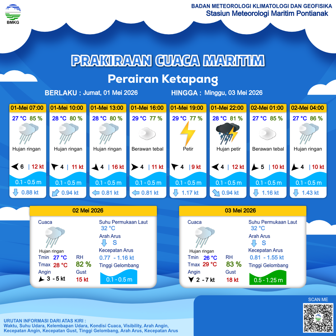 28 Apr 26, 22.00 3 jam kedepan | Hujan Ringan | Timur Laut 6 kt Gust Peningkatan kecepatan angin yang singkat dan tiba-tiba : 12 kt | | | 27 °C | 87 % |