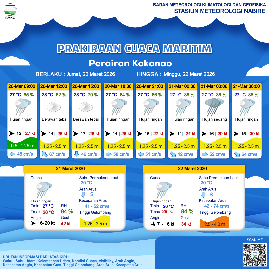 20 Mar 26, 22.00 10 jam kedepan | Barat 15 kt Gust Peningkatan kecepatan angin yang singkat dan tiba-tiba : 30 kt | 1.5 m Sedang | Tenggara 60.2 Knots | 27 °C | 85 % | |
