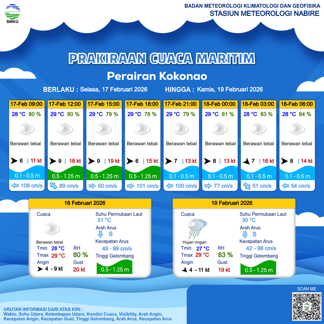17 Feb 26, 12.00 2 jam kedepan | Barat 7 kt Gust Peningkatan kecepatan angin yang singkat dan tiba-tiba : 13 kt | 0.5 m Rendah | Timur 100.0 cm/s | 29 °C | 79 % | |