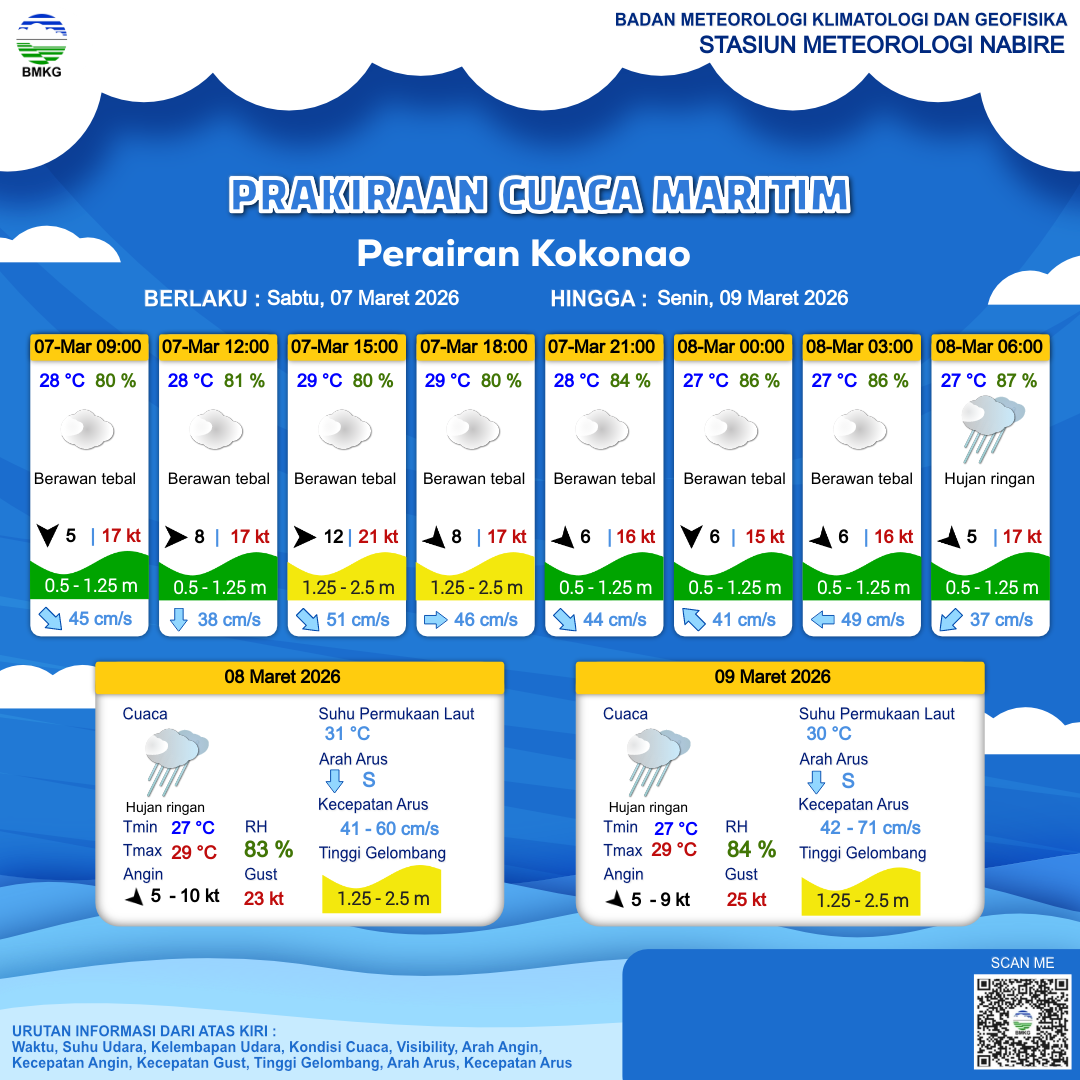 6 Mar 26, 09.00 12 jam yang lalu | Berawan Tebal | Barat 14 kt Gust Peningkatan kecepatan angin yang singkat dan tiba-tiba : 28 kt | | | 30 °C | 80 % |