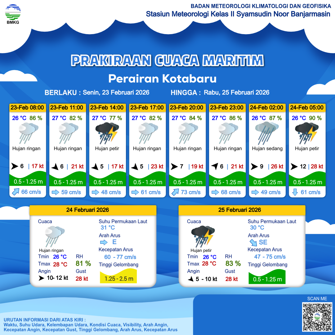 23 Feb 26, 22.00 2 jam kedepan | Hujan Petir | Barat 12 kt Gust Peningkatan kecepatan angin yang singkat dan tiba-tiba : 28 kt | | | 26 °C | 89 % |