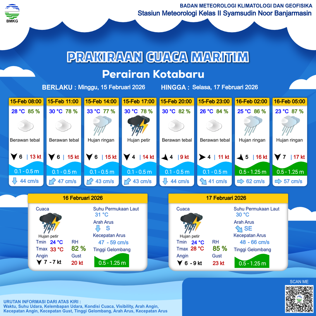 15 Feb 26, 14.00 2 jam kedepan | Barat 4 kt Gust Peningkatan kecepatan angin yang singkat dan tiba-tiba : 13 kt | 0.4 m Tenang | Selatan 42.0 cm/s | 27 °C | 84 % | |